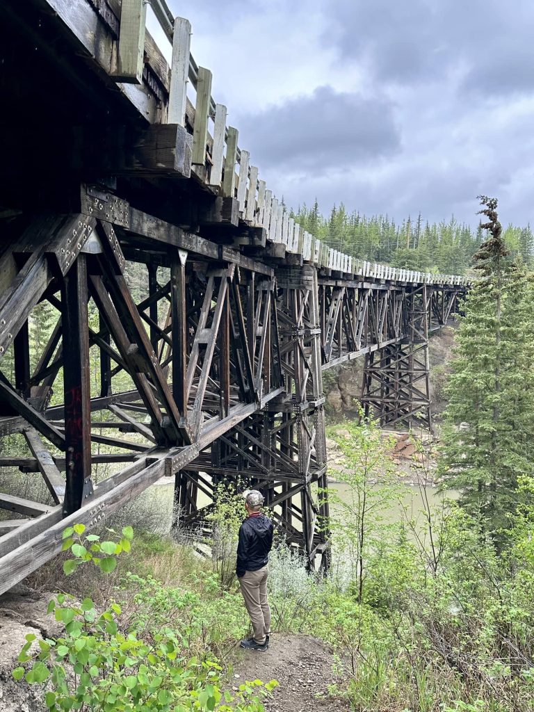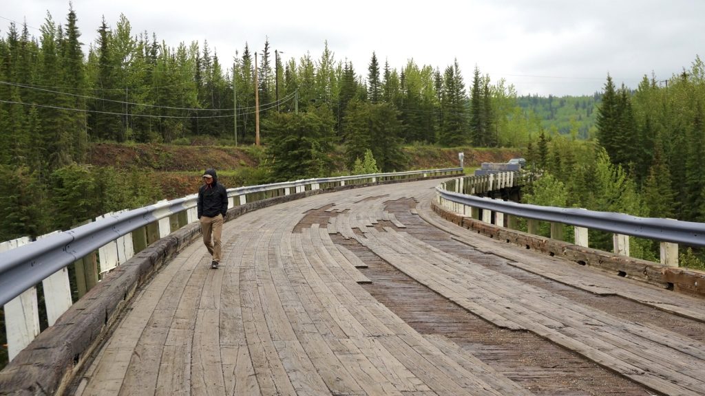 这座桥全木结构,原来是Alcan Highway的一部分,现在已经废弃,成为社区公园的一部分。桥头注明了最高承重7吨,而我们的小白+旺财+我们俩重量将近8吨!看来该减肥了。