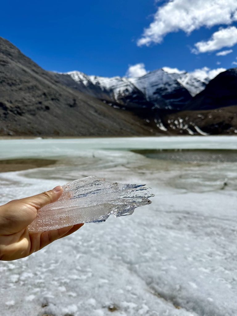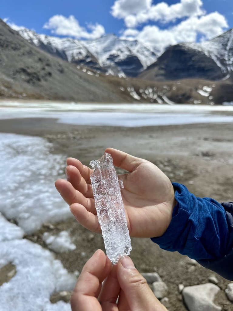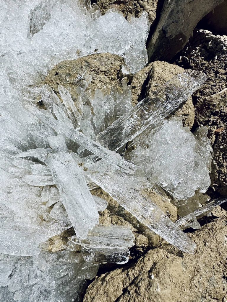 湖边的冰都呈晶体柱状,这是我们未曾见过的天然冰,拿去酒吧卖一定很贵。