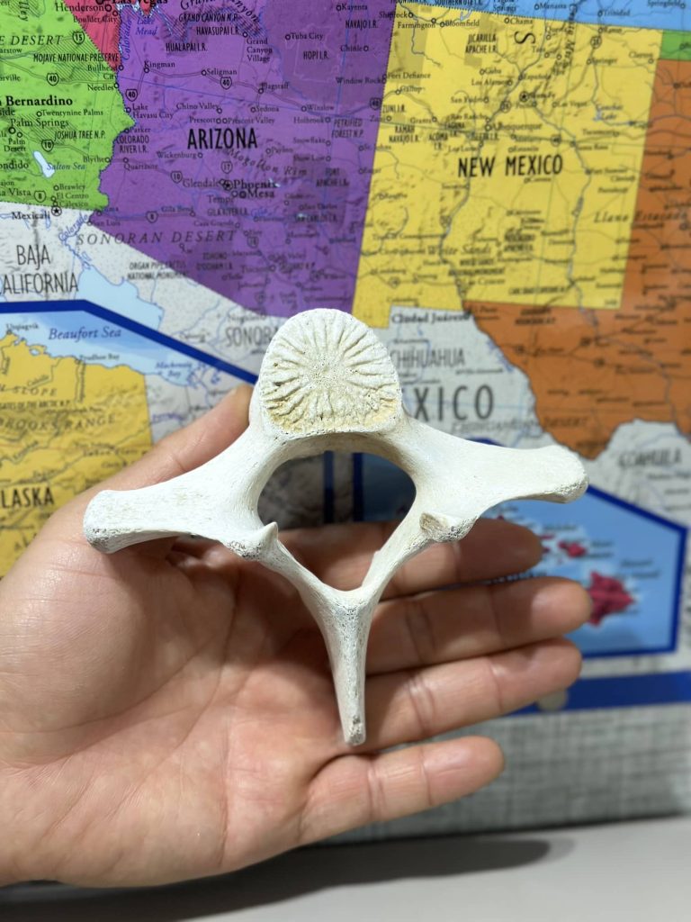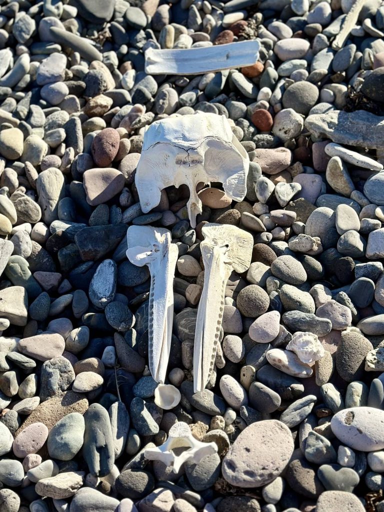 原本想去钓鱼,由于经验不足毫无收获。回来的路上竟然在海滩上发现了鲸鱼的头骨和脊椎骨,我们收藏了一块留作纪念。