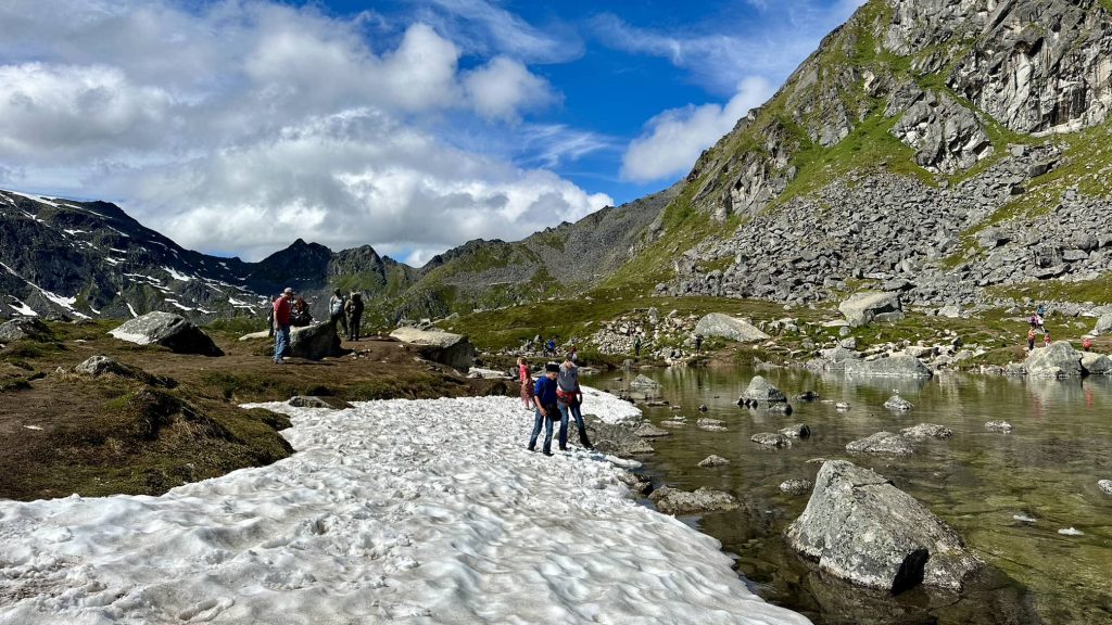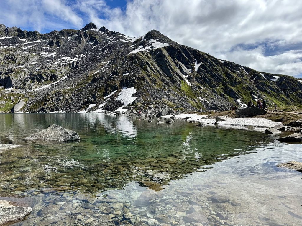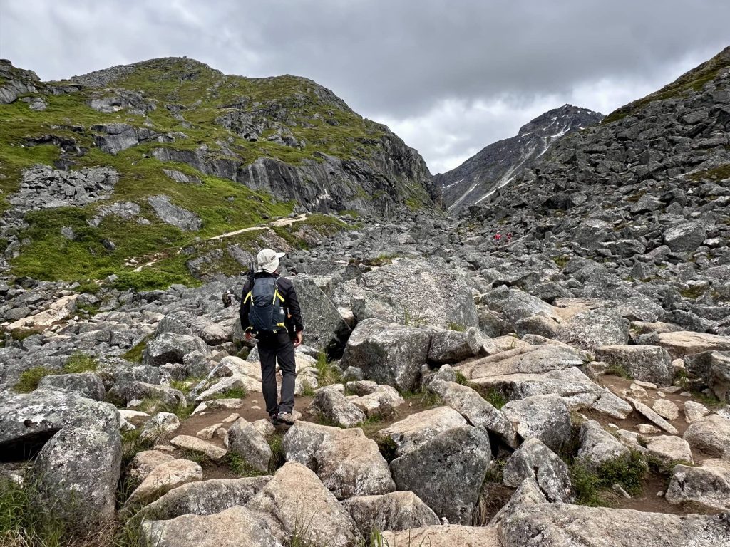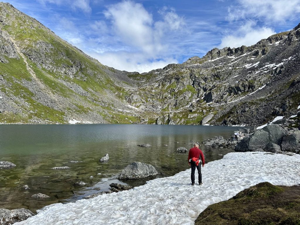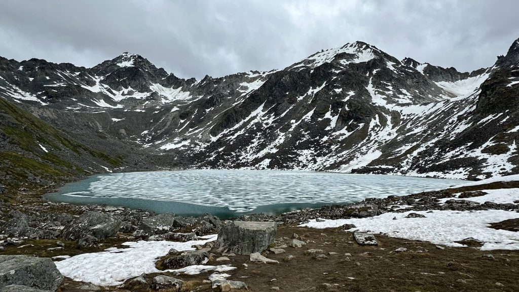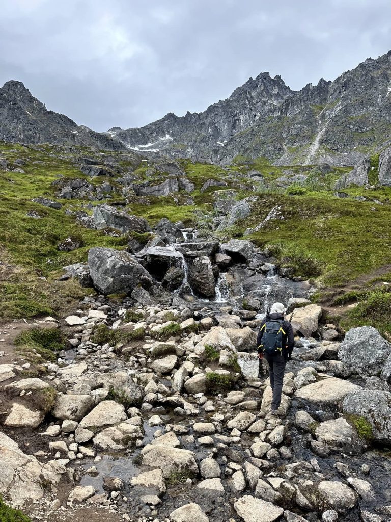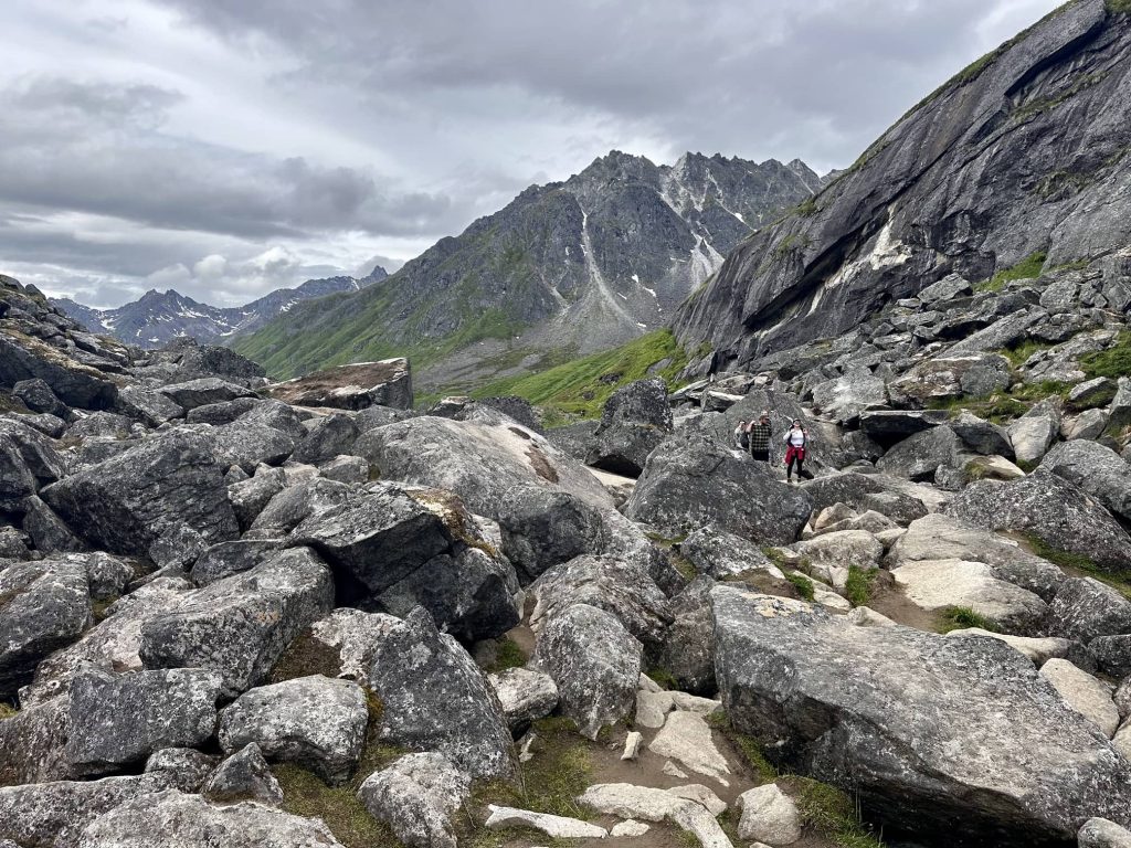 重头戏来了,这是山谷里最著名的Reed Lakes Trail,全长7.2英里,落差2300尺,中间有一大段是巨石阵、乱石岗,人在乱石上爬行,水在脚下石缝中流淌,耳中充满了激流的声音但却看不到水。山上有两个冰川湖,最顶上那一个至今还未解冻。这个trail十分有趣,风景优美,我们十分推荐。
