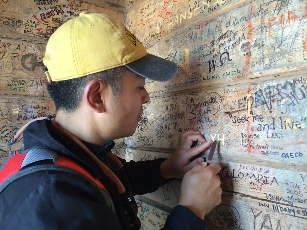 山顶上的一个小窝棚,十年前人们都在里面题字留念,我们没带笔,只能用小刀刻下一个符号留作纪念。