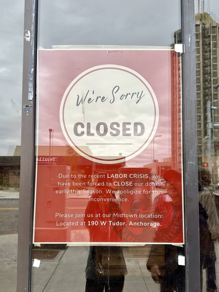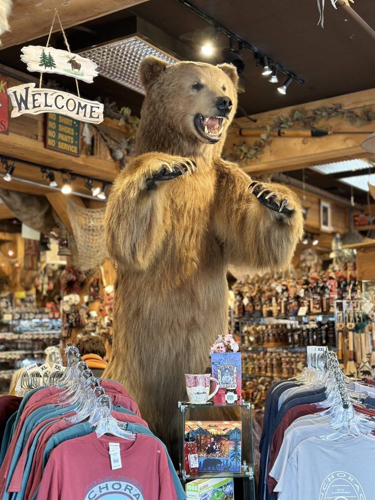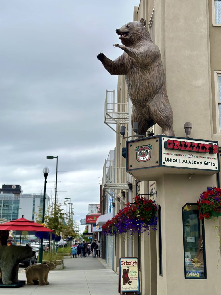 市中心的繁华地段就两条街,加起来一共几百米长,买卖铺户一家连一家,开门营业的大概有七八成,剩下的要么休息,要么已经倒闭了。逛了几家礼品店,所有的东西都来自浙江省义乌市。又逛了一家艺术品商店,一进门就有店员热情地介绍:本店所有商品都是本地艺术家的手工制作!果然,东西好坏不论,全都贵得离谱。逛了一整条街,惊讶地发现每一家店铺门口都贴着布告,上面用大号粗体字写着:店内没有厕所……!介是什么路数?我们以前只见过:“厕所只供顾客使用”,或者明码标价收费使用,在这里,阿拉斯加人民直接了当告诉你:We are not giving no shit.