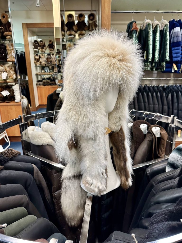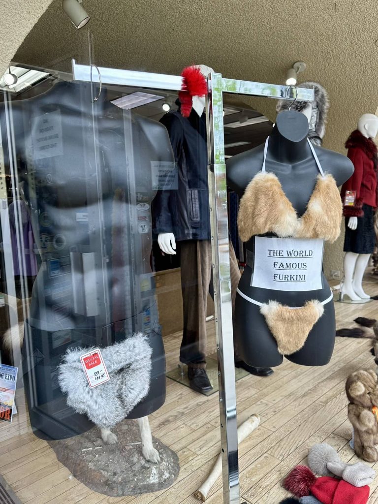 市中心的皮草店,左上图的帽子用了半头狼,两个爪子挂胸前,大狼尾巴垂脑后,要价2500刀。右上图是阿拉斯加人民的冬季海滩比基尼。