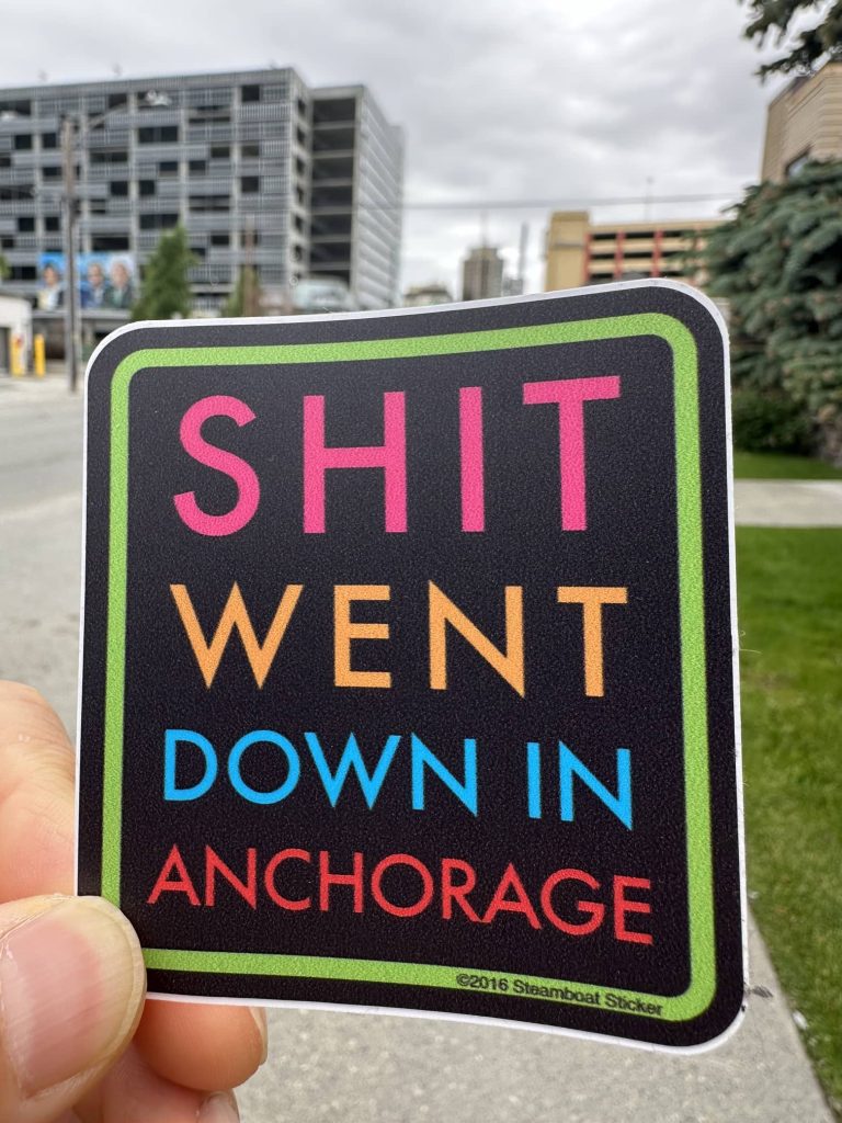 无论如何也算是到此一游,临走前买个纪念品,我们选了一小张贴纸,上面写着:Shit went down in Anchorage!